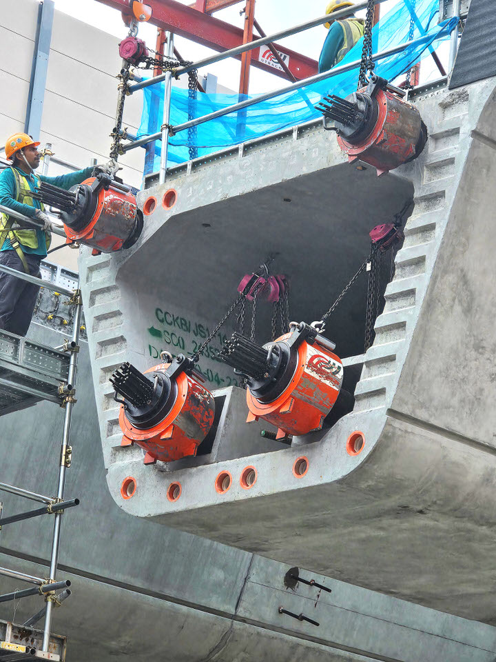 This project saw us working across three upcoming MRT stations—Choa Chu Kang, Choa Chu Kang West, and Tengah. Our scope included post-tensioning works for all precast viaduct segments, where we supplied and installed approximately 3,880 tons of PC strand.