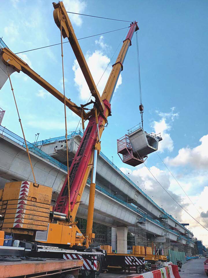 Concurrently, our operation teams carried out the erection of 3,008 precast box girder segments, spanning a total viaduct length of 11.5 km. This was executed using two launching gantries under the span-by-span method and four pairs of lifters under the balanced cantilever method.